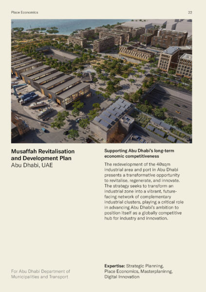 Internationally, the team has delivered projects of significant scale with regional and national impact. This includes supporting Abu Dhabi’s long-term economic competitiveness through the Musaffah Revitalisation and Development Plan, which seeks to transform an industrial zone into a vibrant, future-facing network of complementary industrial clusters and advance Abu Dhabi’s ambition to become a globally competitive hub for industry and innovation.