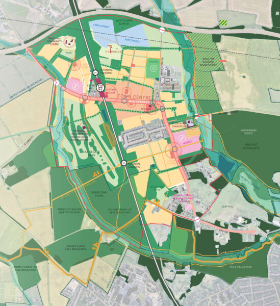 Our portfolio includes our current role supporting Enfield Council at Crews Hill in London, one of Labour’s first twelve New Town locations, where we are developing a long-term vision and masterplan supported by a new SPD. Our work has focused on the creation of a digital evidence base as well as landowner and developer engagement to inform clear design development guidance, including proposals for a major new centre around Crews Hill station on existing “grey belt” land.